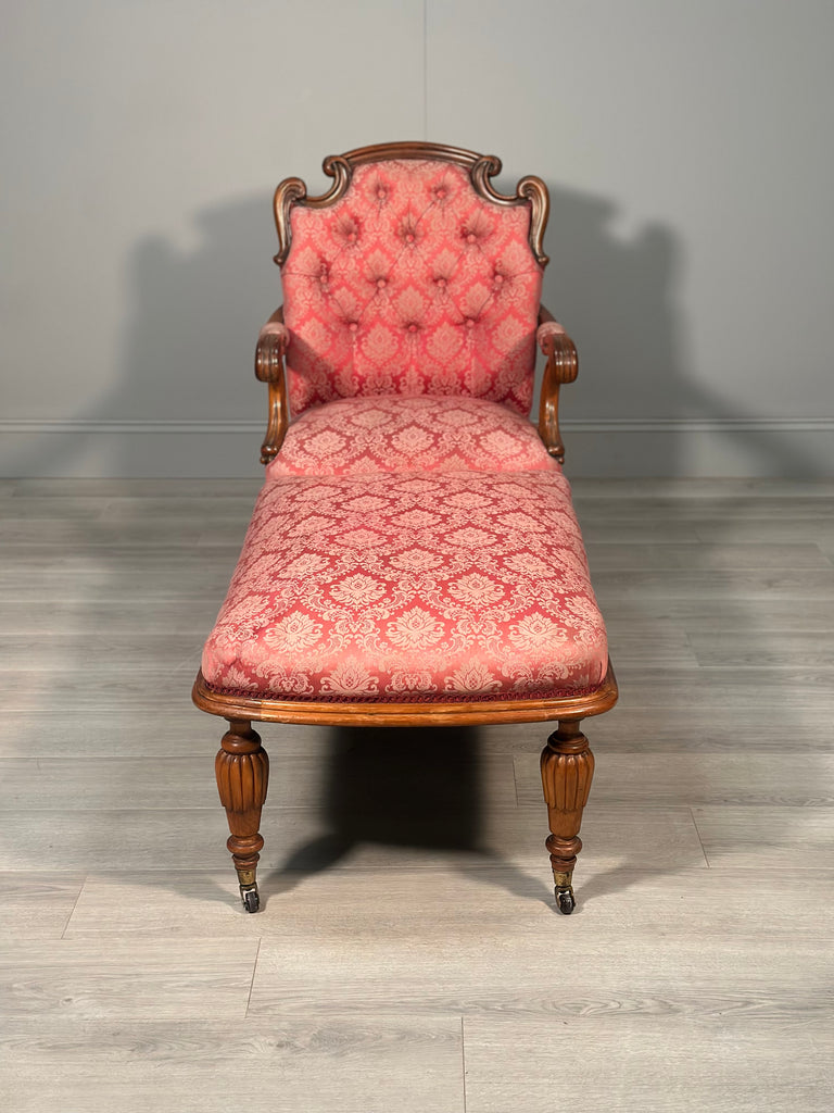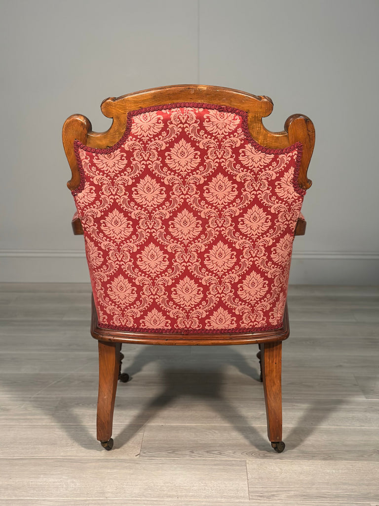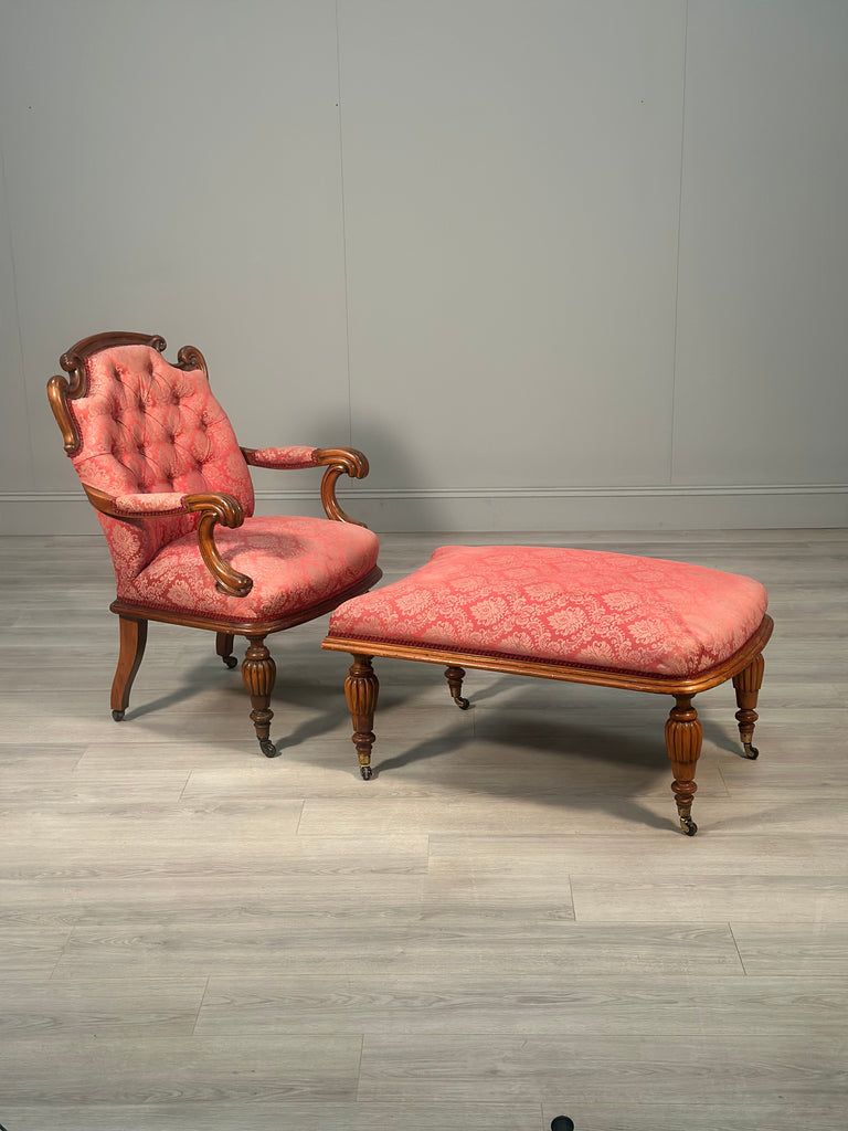 A special antique armchair and matching footstool in a Queen Anne revival style dating to the 1920’s. The armchair and footstool fit seamless together to create a piece that offers excellent comfort. It has a solid mahogany frame sitting on a redded leg with brass and ceramic cup castors. The upholstery is original and in very good overall condition with only a couple of slight marks. The frame has a couple of old worm holes but inactive and treated.