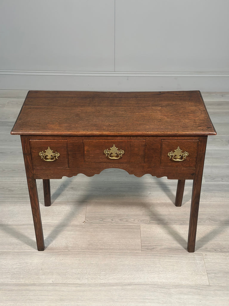 A small Georgian oak lowboy dating to the start of the 19th century. The lowboy is constructed from English oak and consists of three drawers all with original brass handles. The table is in very good original condition with a beautiful warm colour.
