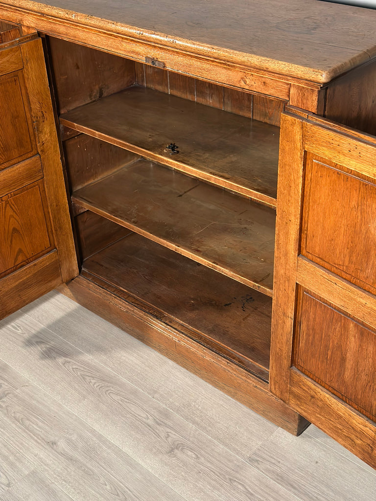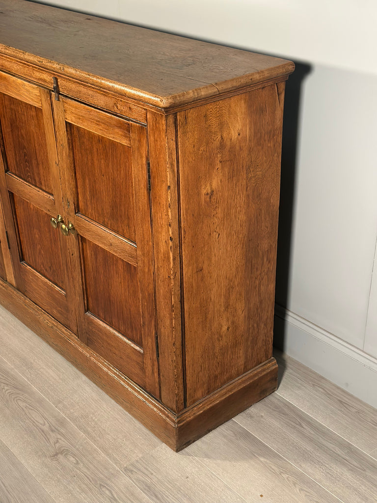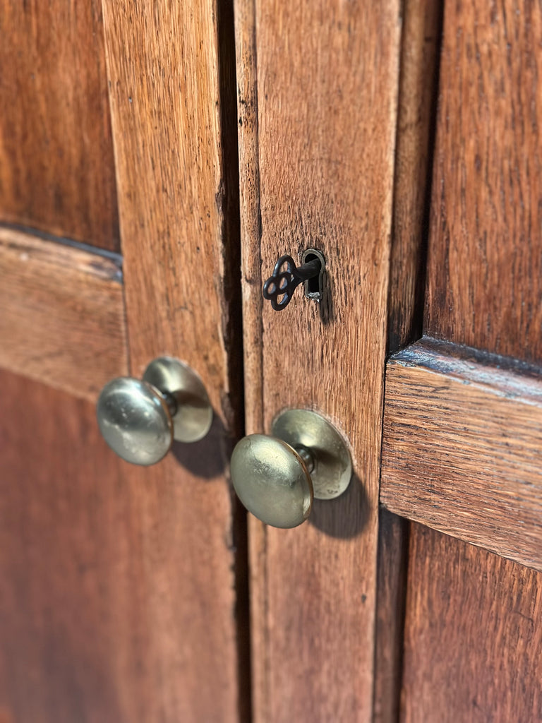 Large antique oak school Cupboard dating to the start of the 20th century. The cupboard is made entirely from solid oak showing in its weight, it consists of two sections both with two internal shelves offering plenty of storage. One set of doors has a working lock and key with the other having a turn button catch. The cupboard has a fantastic golden colour and is in good solid condition with age related wear you would expect.