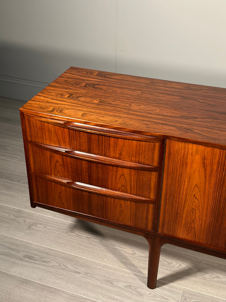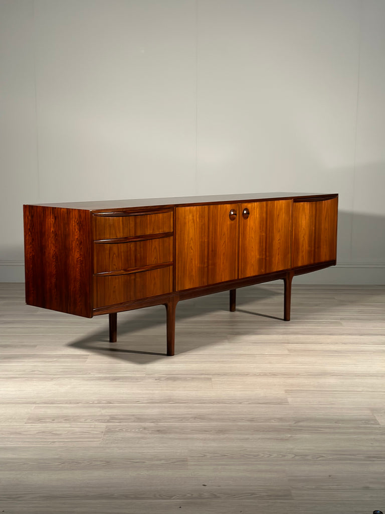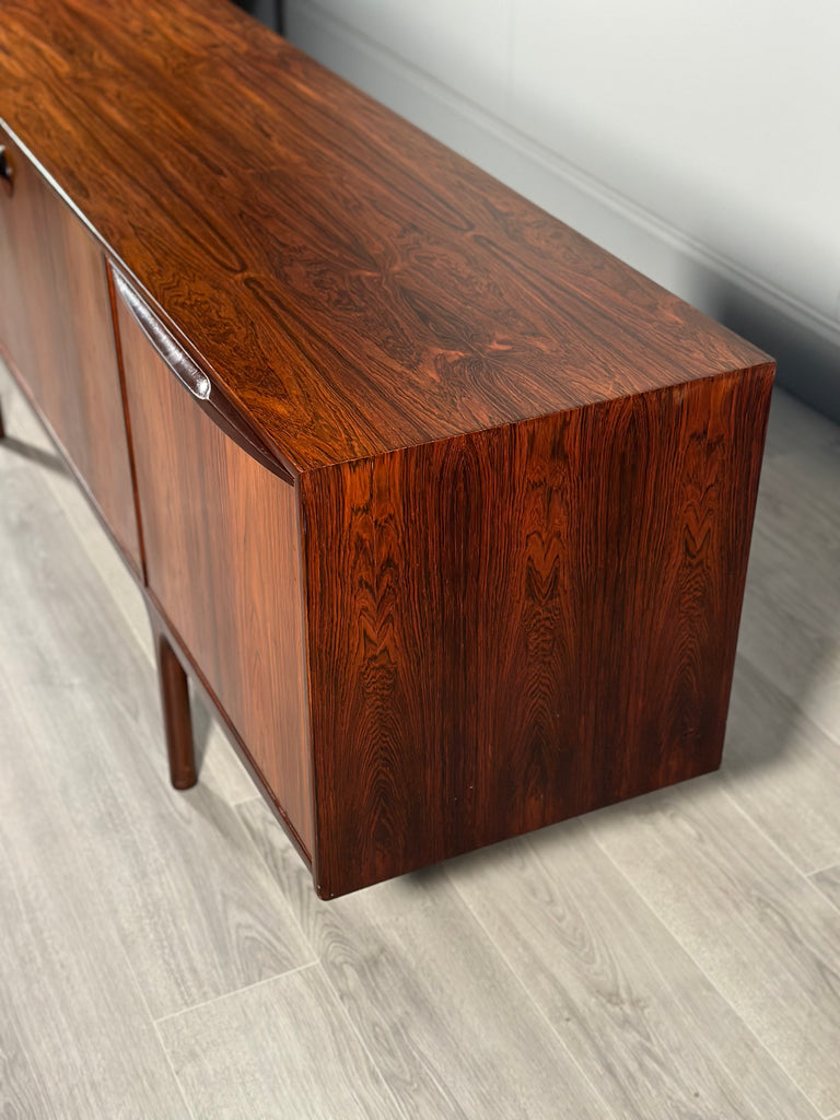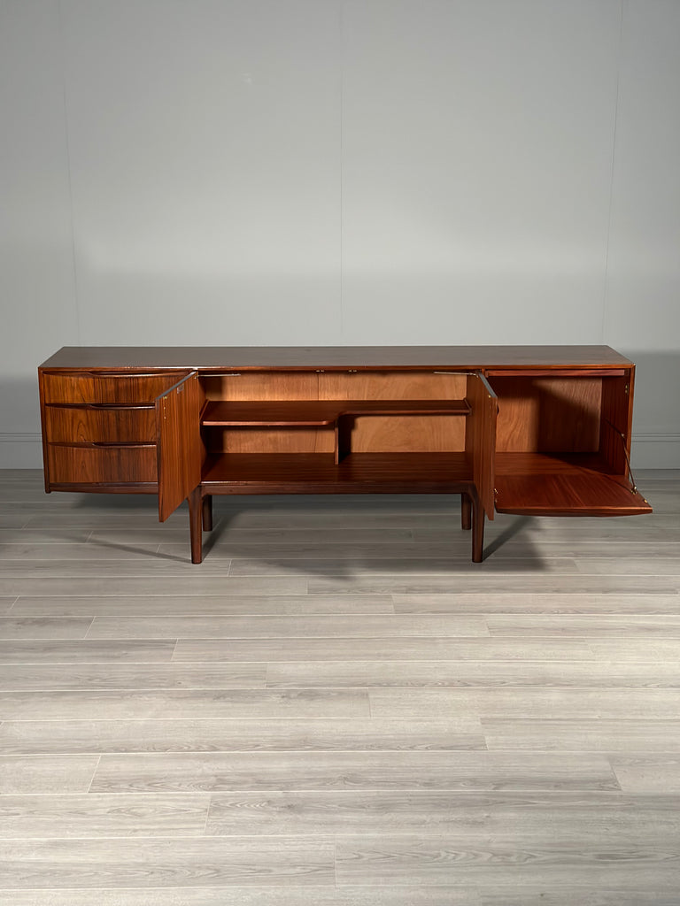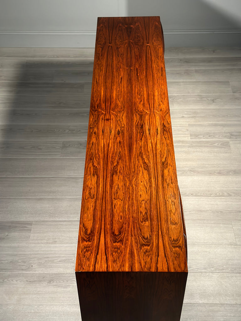A large rosewood McIntosh sideboard dating to the 1960’s, the sideboard consists of three drawers, centre double cupboard and pull down side cupboard. A superb model with bookmatched rosewood veneers throughout. In very good condition with some light age related wear.