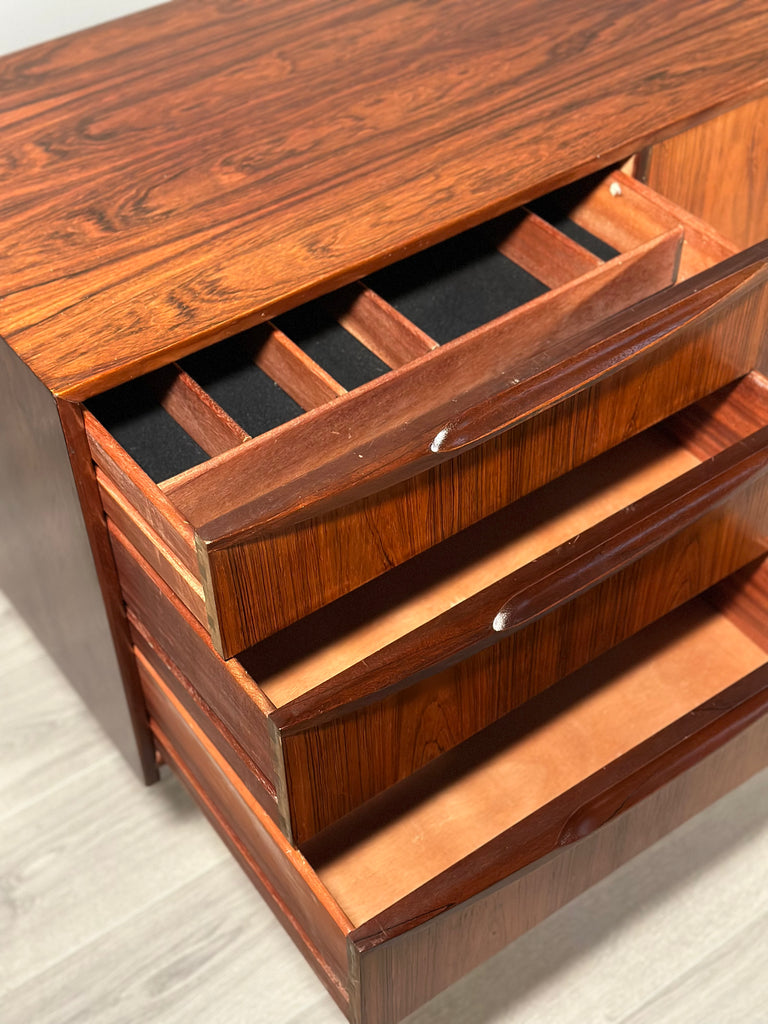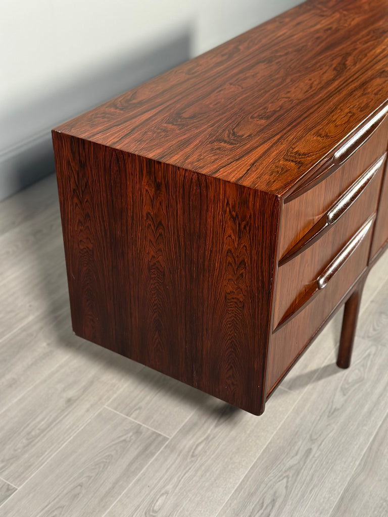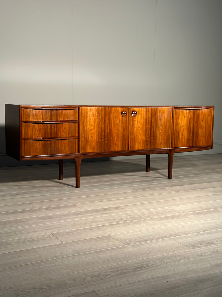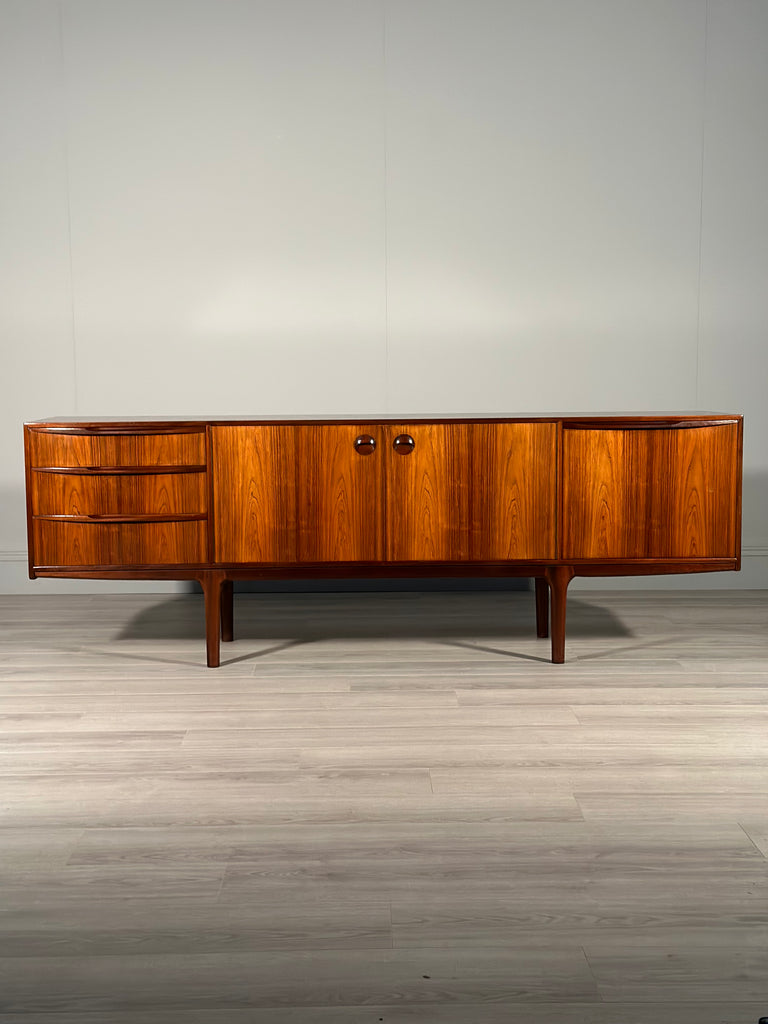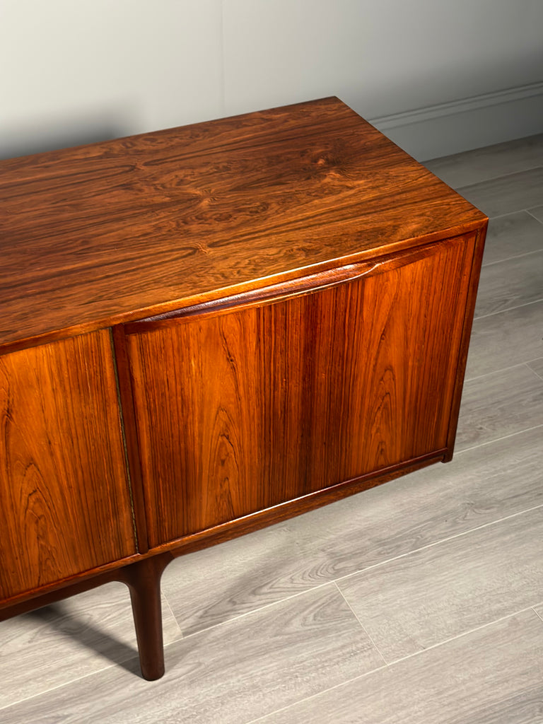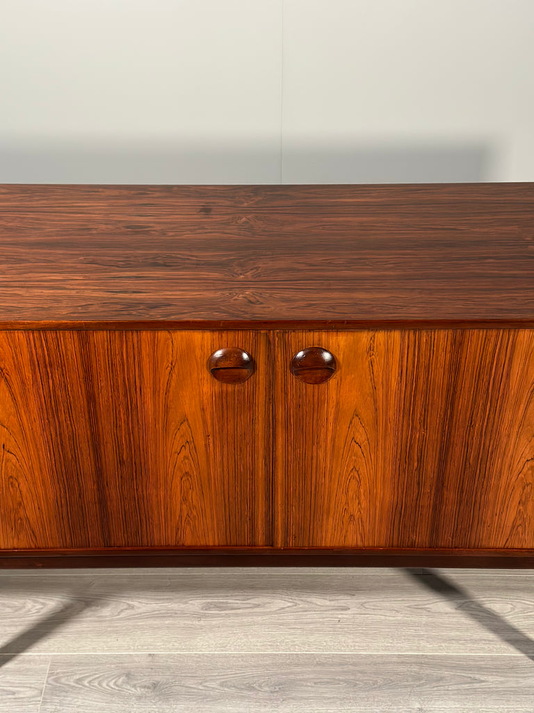 A large rosewood McIntosh sideboard dating to the 1960’s, the sideboard consists of three drawers, centre double cupboard and pull down side cupboard. A superb model with bookmatched rosewood veneers throughout. In very good condition with some light age related wear.