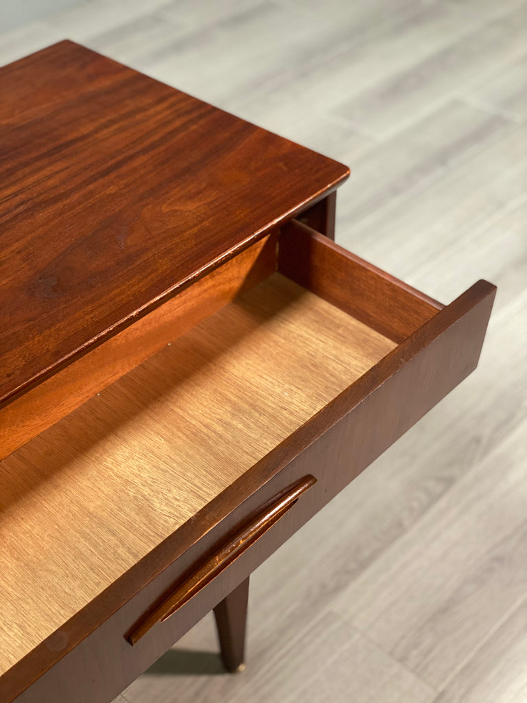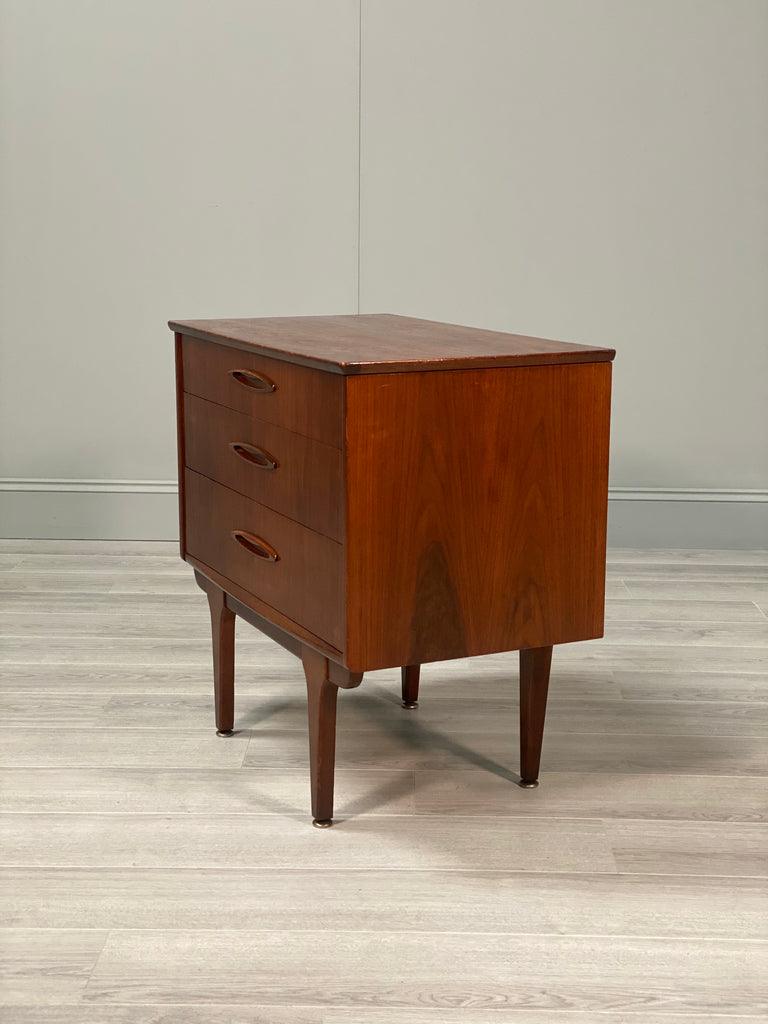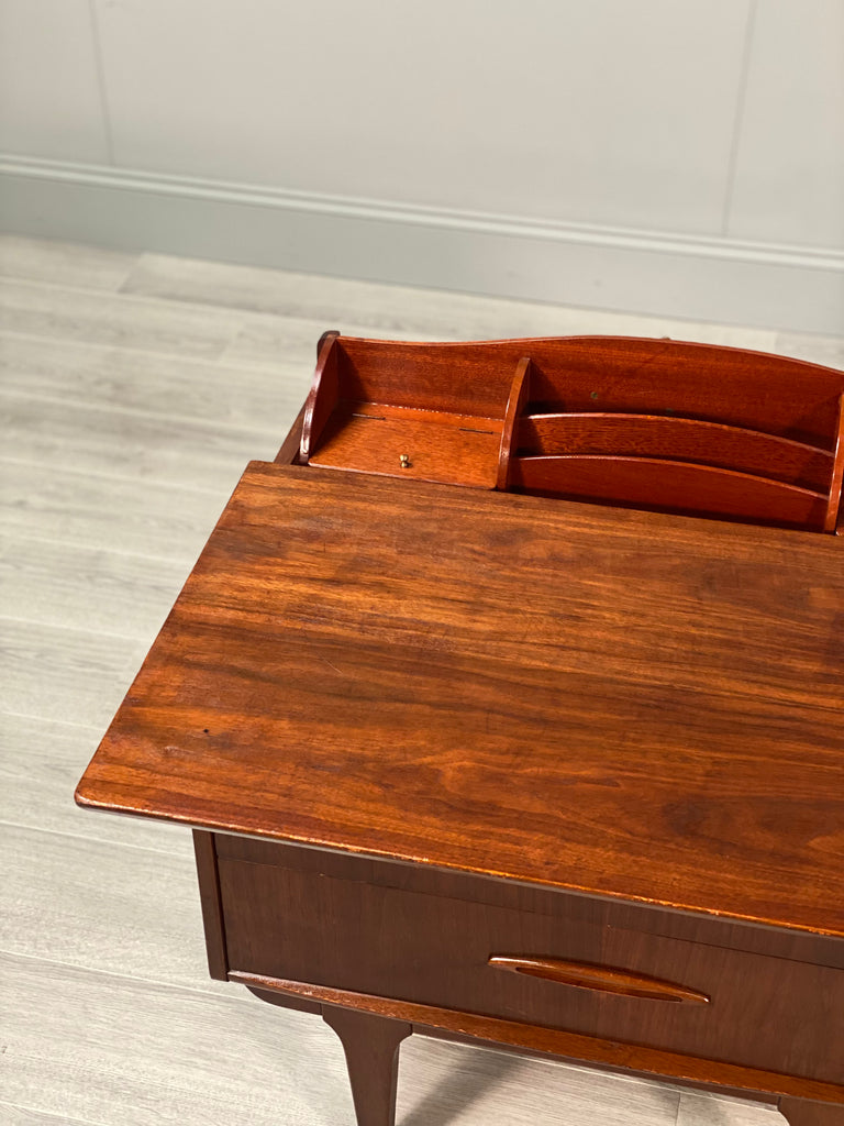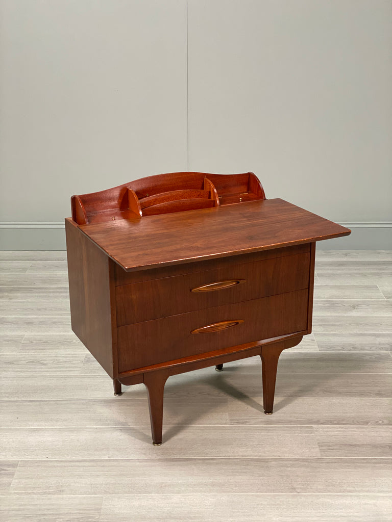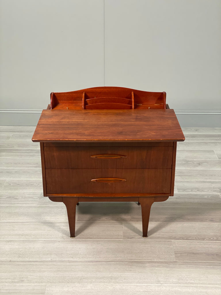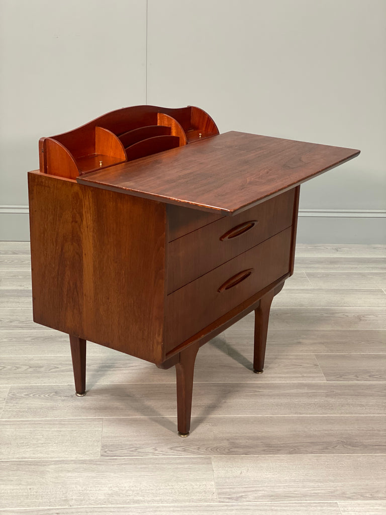 A small chest of drawers that converts into a writing desk made by Jentique dating to the 1960’s. The chest of drawers easily converts into a writing desk by simply pulling the top to reveal the letter rack and 2 small drawers. Made with teak veneers and sitting on solid teak legs with adjustable feet for uneven surfaces. In good condition with age related wear.