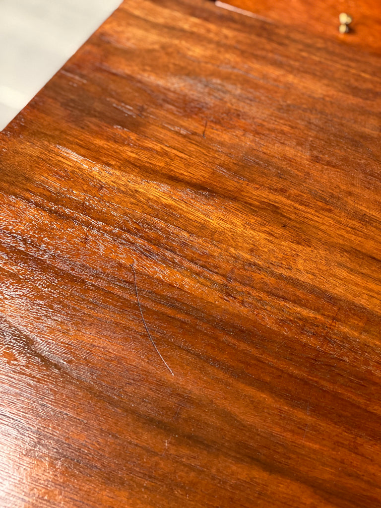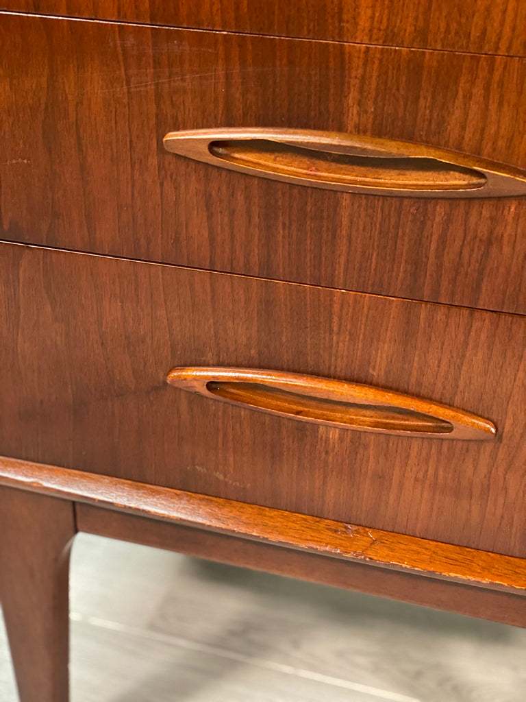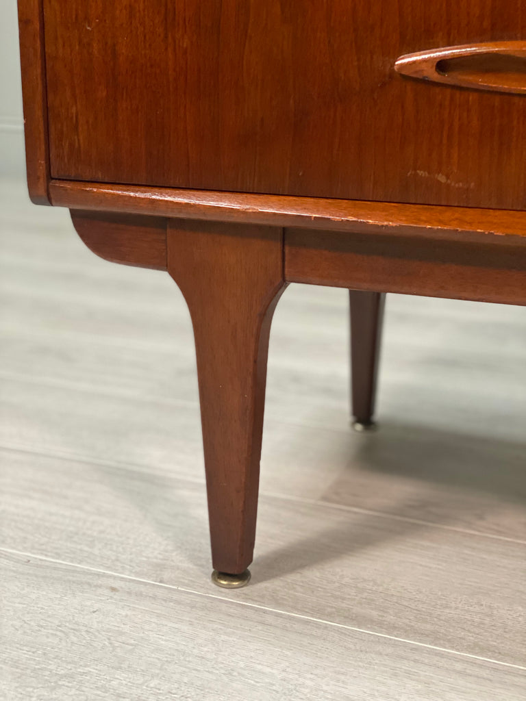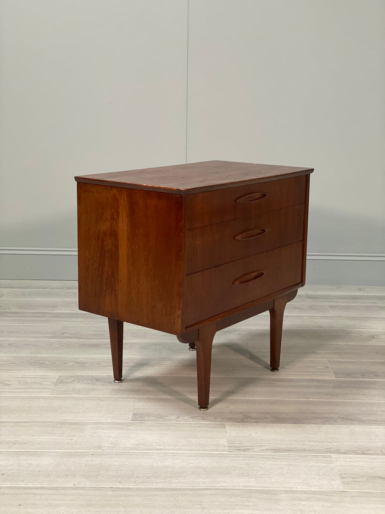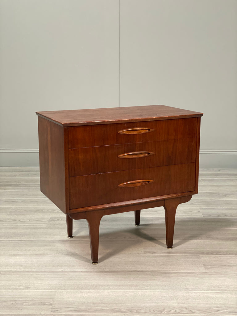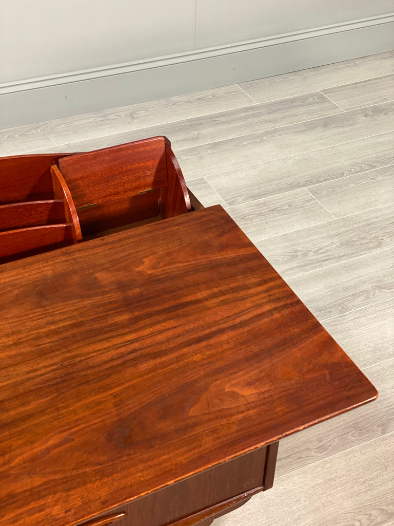 A small chest of drawers that converts into a writing desk made by Jentique dating to the 1960’s. The chest of drawers easily converts into a writing desk by simply pulling the top to reveal the letter rack and 2 small drawers. Made with teak veneers and sitting on solid teak legs with adjustable feet for uneven surfaces. In good condition with age related wear.