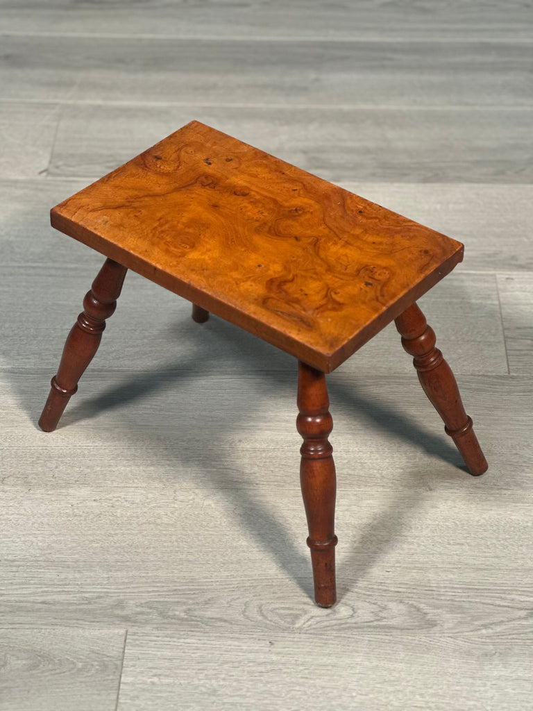 A unique solid burr Yew wood Victorian stool. The stool has a solid burr Yew wood seat with four turned yew wood legs. It boasts a superb colour and beautiful figuring to the seat and is in very good solid original condition.